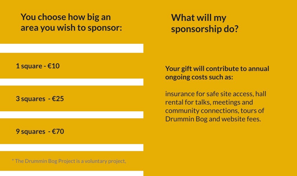 To support the Drummin Bog Project in 2023, the Drummin Bog Project committee are inviting those who may not have the time or resources to be involved in a restoration or rewilding project, to instead sponsor a 3×3 m square area of beautiful Drummin Bog!