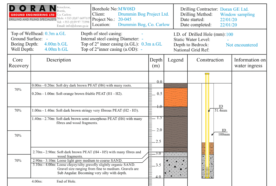 As part of the surveys, Doran Drilling was employed to undertake the preliminary Window Sampling on Drummin Bog to evaluate the depths of peat, determine the underlying deposits and install standpipes for water monitoring purposes.